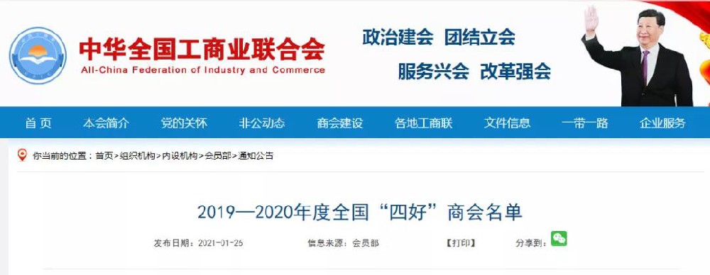 2021年1月26日,全国工商联办公厅印发《关于认定2019-2020年度全国“四好”商会的通报》。按照《全国工商联办公厅关于开展2019-2020年度全国“四好”商会认定工作的通知》要求,对照全国“四好”商会建设标准,在各地工商联逐级推荐、省级工商联审核把关、全国工商联组织专家评审的基础上,经全国工商联主席办公会议审议通过,全国多个重庆商会被认定为2019···